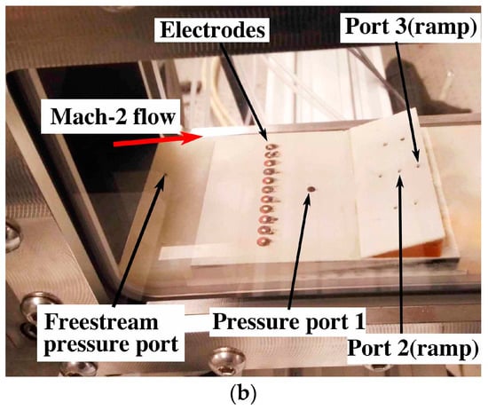 The schematics of the ramp model are illustrated in Figure 3. Eleven electrodes were flush-mounted on the wall in a spanwise direction, with 5 anodes and 6 cathodes arranged in an alternating fashion. A 19.4° ramp with a height of 10.9 mm was attached to the test section wall with its leading edge 30 mm downstream of the electrodes, as illustrated in Figure 3a. The ramp surface was made from a 1 mm thick alumina 96 ceramic plate to protect the model from the high-temperature air heated by plasma. There are pressure measurement ports along the center line and their location is indicated in Figure 3a. The ramp angle of 19.4° was selected to match a previous experiment in reference [24] that was tested at Mach-7. The ramp model was fixed in the test section as shown in Figure 3b. Both side walls are equipped with windows made of quartz to allow for optical diagnostics. Due to the 1° test section wall expansion, the Mach number is slightly increased over the distance, making the effective flow Mach number 2.04 at the ramp.