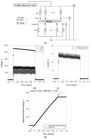 Electrical circuit and typical plots of electric parameters: (a) Schematics of electrical circuit and measured voltages; (b) voltage traces; (c) anode current; (d) plot of deposited plasma energy and linear fit result.