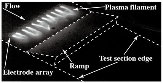 In [13,14,15,16] and other publications, the plasma-based technique and the mechanisms of the plasma–flow interaction were examined in supersonic flow. It was found that the near-surface electric discharge is well applicable for the purposes of the modification of surface pressure distribution, flow field pattern, and shock wave formation. The quasi-DC (Q-DC) electric discharge [15] forms filamentary plasma penetrating in the streamwise direction, which intensely and locally heats the gas, leading to a volumetric expansion and shock wave generation. The Q-DC electric discharge was also found to have great effectiveness in ignition and flame holding in scramjet engines [17], flow modification inside a flame holding cavity [18], boundary layer modification [19], inlet control [20], and oblique shock wave control [21,22].