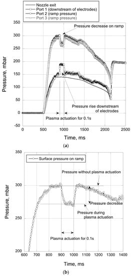 The significant change in shock locations, as shown in Figure 6, suggests that there was a remarkable pressure change at the rear side of the electrodes and along the surface of the compression ramp. Typical pressure timeseries are shown in Figure 7. A pressure increase was observed downstream of the electrodes, which was consistent with past studies without the ramp [15]. A significant pressure drop was observed along the surface of the ramp at ports 2 and 3. This is clear evidence that the plasma actuation ahead of a ramp (flap) can control pressure force and thereby cause a change in the pitching moment acting on the flaps. It should be noted that the pressure curves of ports 2 and 3 were almost identical and hence, and separation ahead of the ramp was insignificant without plasma actuation. In the following results and discussion, the pressure drop on the ramp surface was evaluated based on the pressure at port 2 and quantified according to the definition of pressure decrease illustrated in Figure 7b.