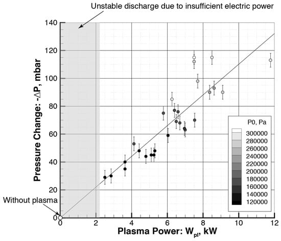 The flow parameters were varied independently to form the test matrix: P0 = 1, 2, 3 bar and T0 = 294, 400, 500, and 600 K. This led to variation in plasma power in the range of 2.5–11.8 kW and an appropriate pressure decrease on the ramp. Figure 8 shows the pressure effect vs. average plasma power. The uncertainty of the pressure change reading was almost 10 mbar, represented as error bars in the plot. Since the pressure change value was always negative, the y axis denotes −ΔP (mbar). The fill color of the dots in Figure 8 indicates the stagnation pressure in each test case and a circle at the origin illustrates the no-plasma case with no pressure change. Figure 8 demonstrates that the ramp pressure change was linearly dependent on the average plasma power. An increase in plasma power produces an increase in the heat energy deposited to the flow, this intense and local heating proceeds through multiple relaxation pathways to a pressure increase, and thus an increase in plasma power increases the flow control effect over the ramp [15]. It should be noted that the gray shaded area in Figure 8, indicating a low plasma–power zone with Wpl < 2.1 kW, corresponds to an unstable discharge pattern because of insufficient electric power to maintain steady plasma filaments. There was also a trend of the ramp pressure impact (−ΔP) increasing with an increase in stagnation pressure, which implies that the pressure change ratio −ΔP/Pstatic could be an important parameter correlated against other flow control parameters.