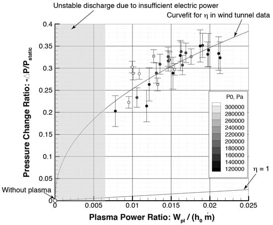The main focus of this study was the pressure control on the ramp, and the quantity of the pressure change ratio divided by the relative plasma power, η = [−ΔP/Pstatic]/[Wpl/(h0·ṁ)], can be defined as “task-related effectiveness”. The straight line, η = 1 in Figure 9, shows the task-related effectiveness to be unity. In all tests, η was always higher than 1 and almost attained 25 at lower relative power. At a higher relative power of around 0.02, η was higher than 1 and reached around 17.5, but the increment decreased within the scope of plasma power attained in this study.
