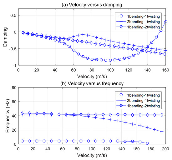 The flutter boundary should be determined initially as an important aeroelastic behavior. The linear flutter speed can be obtained from the state-space matrices (Equation (10)) using linear eigenvalue analysis. The stability and frequency of the system are determined by the real and imaginary parts of the eigenvalues. The flutter speed can be calculated when the real part of eigenvalues of the aeroelectroelastic system become positive.