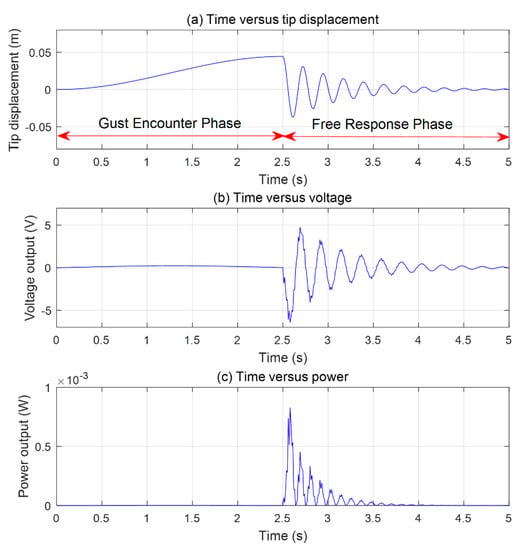 The operating conditions for the subsequent results are as follows; cruise speed of 40 m/s, 1500 m above sea level, the gust shape was for a discrete “one-minus-cosine” function with peak intensity of 5 m/s, a gust wavelength of 100 m, and the gust interacts with the wing at the initial time. The displacement is measured at the leading edge of the wing tip, where the EH data was collected from a pair of PZTs layers at the leading edge of the wing root for the highest energy output density.