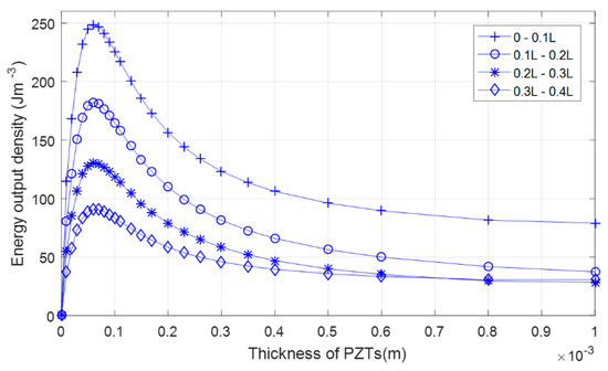 The energy output value of every PZTs layers at different locations can be obtained from the solution of Equations (10) and (13). The thickness range of PZTs layers is from 1.00 × 10−5 m to 1.00 × 10−3 mm. The relationship between the energy output density and the location of the PZTs is given in Figure 7. A similar variation of the output density with the location is observed. The first four pairs of layers from the wing root at leading edge are chosen for the higher energy output density. With the rising of thickness, the energy output density peaks when the abscissa value reaches 6.00 × 10−5 m, followed by a rapid decrease. The tendency above happens to all listed PZTs layers at different locations, which also has a great influence on EH in a certain thickness range, as indicated in Figure 7.