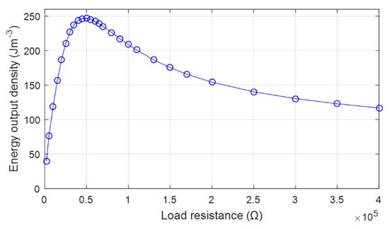 The effect of the external load resistance is shown in Figure 8, obtained from Equations (10) and (13). The energy output density increases with the load resistance at the beginning and reaches a peak value of 246.83 J m−3 at 5.00 × 104 Ω.