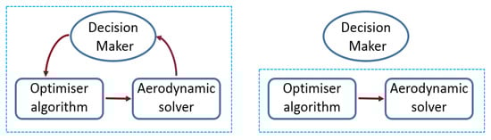 The aerodynamic design of aircraft has benefited exceptionally from the development of optimisation techniques [], which have been integrated into the flow solvers’ software to accelerate the process of trade-off between the requirements of different disciplines [,]. Conventional optimisation techniques have been explored extensively to help reduce the length of the design cycle [,,,], motivated by the need to reduce the computational cost of new designs with high optimality solutions []. In a multi-objective optimisation problem, the target is usually to find a well-distributed Pareto front instead of a set of solutions that satisfy the DM’s requirements [,]. This presents many problems concerning computational cost and data analysis, since once the optimisation process is started, it is not possible for external interaction to guide the search to the ROI. However, by including human input into the optimisation process, the length of the optimisation cycle may be reduced significantly.