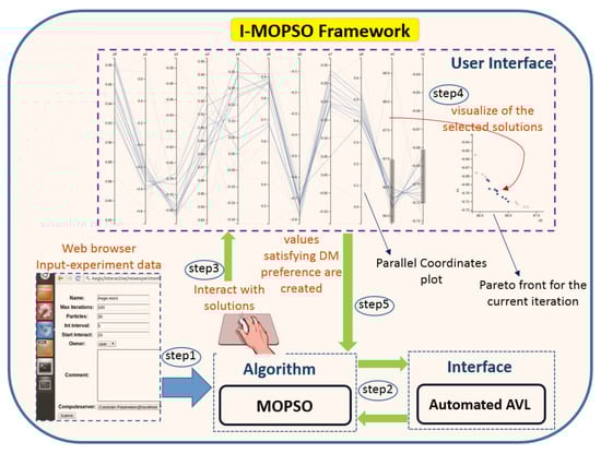 In contrast, there are not many studies that use Particle Swarm Optimisation (PSO) for interactive optimisation [], even though PSO is a comparatively simple concept and is computationally faster and relatively inexpensive in terms of computer memory requirements compared with other population techniques [,,]. Agrawal et al. proposed an interactive particle swarm approach for solving multi-objective optimisation problems, including a DM preference []. The interactivity commences only after a finitely large archive of non-dominated solutions is reached. The role of the DM is to select a preferred solution among the non-dominated Pareto solutions by making a pairwise comparison. The approach used an adaptive-grid mechanism for incubation of the particle swarm for the multi-objective optimisation. A good summary of interactive Multi-objective Optimisation Methods based on MAVT can be found in a previous study []. However, such methods are not yet applicable to real-world problems. Methods in this category are limited to showing information or plots for selected points in the objective space, whereas the concept of interactive optimisation is to provide enough information about the design space to the DM to be able to steer the optimisation search to the ROI efficiently [].