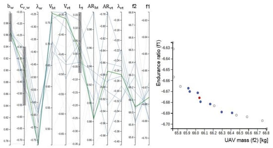 Applying such constraints to multiple axes enables the DM to visualise the correlation that exists between the design variables and objective functions. By selecting a range of the desired solution along the objective axis, particles that contribute to this solution from all the design variables will be highlighted. The analysis and investigation of the highlighted and non-highlighted solutions provides an insight into the correlations that exist between the design variables and objective functions. We would like to stress here that MOPSO in this framework is generating the design variables in the interval [−1, 1]. Thus, the design variables’ values displayed on the parallel coordinates will also be in the interval [−1, 1]. However, scale and translation factors are applied to each design variable after initialisation to deliver those particles with the appropriate values to the external model (Interface-AVL) []. Figure 3 shows an example of DM selections that can be made with parallel coordinates, and the corresponding observations that may be obtained from it, as a location on the Pareto front. Note that the DM can select a single particle, which is shown by the colour green on the parallel coordinates and red on the scatter plot.