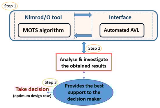 Figure 4 summarises the components of the automated framework used in the various stages of development. It consists of three main parts: Nimrod/O design optimiser tool, optimiser algorithm (MOTS) [,,], and flow solver. The flow solver used here is the AVL. Due to the fluid nature of the initial design process, it is not recommended to use high fidelity analysis design tools, such as Computational Fluid Dynamics (CFD), at this stage as they can be unnecessarily costly [,]. What is required is a tool that strikes a balance between sufficient accuracy and computational cost [,,,]. Piperni et al. [] and Zhang et al. [] have argued that the level of fidelity that should be delivered by the models is mostly determined at the development stage, which the design process aims to enhance. On the other side, the optimisation was performed using the Multi-Objective Tabu Search (MOTS) algorithm, chosen for its suitability for this type of complex aerodynamic design problem [,,].