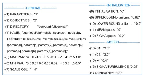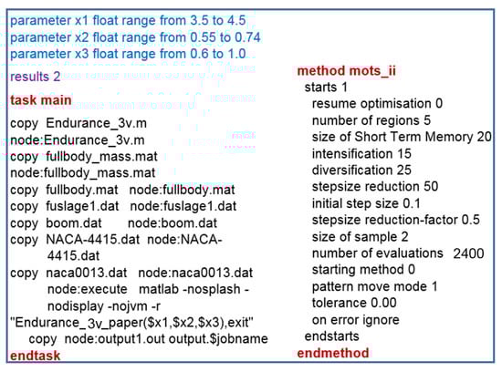 The Nimrod/O tool offers a declarative file to allow users to focus on the technical issues of the design problem instead of concerning themselves with programming details. Figure 5 shows an example of a Nimrod/O declarative file, which can be written by any editor. It consists of three main sections; each section defines a particular part of the optimisation process. The first part defines the design variables: integer, float, and text. The second section defines tasks required to be executed. The final section of the schedule file contains the optimisation method. In addition, the schedule file may include constraints, which are located after the first part. The constraints can be either hard or soft—hard cannot be violated, whereas soft can. In the case of soft constraints, penalty values should be added to the objective functions. More sections may appear in the schedule file for the named results. If such sections exist, they will be after the constraints section and linked to the multi-objective optimisation algorithms only. Such sections will specify the number of objective values that will be computed during the run. If such sections are missing, then the value of the objective function is unity. By using this file, the user can simply define the design variable characteristics, tasks to be executed, and the algorithm to be used. Using such a tool, the designer was enabled to execute a computational model over various design variables utilising the resources on a global computational grid. The tool computed the value of the objective function corresponding to different combinations of parameters, and the results were sent to a cluster of processors [,,]. The design space was explored exhaustively over a range of pre-set design variables to minimise a selected objective function (endurance ratio and UAV total mass).