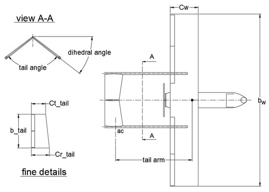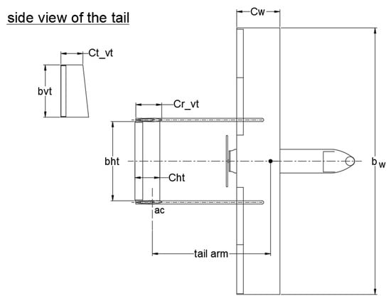 In order to obtain a feasible solution for the full UAV configuration by the aerodynamic shape optimisation process, the optimisation problem should include wing and tail design variables simultaneously, since aerodynamic efficiency and stability characteristics are inter-related [,,]. The trade-off in any wing-tail design is between producing the desired stability and control moments versus weight and parasitic drag. Nine design variables are used to optimise the Aegis UAV with U-tail shape: wing span (), wing root (), wing taper ratio (), horizontal tail volume (), vertical tail volume (), tail arm (), horizontal tail aspect ratio (), vertical tail aspect ratio (), and vertical tail taper ratio () (see Figure 7).