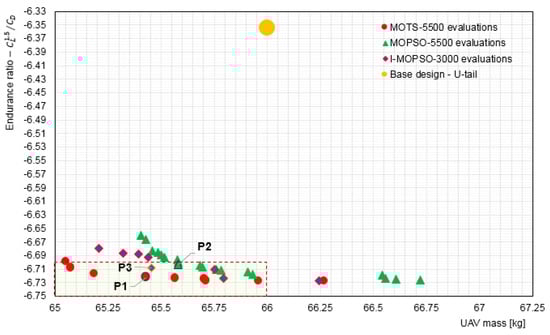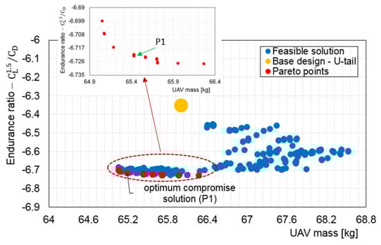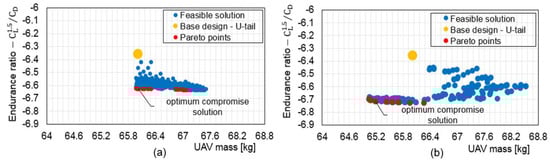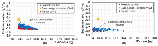 The improvement in the endurance ratio for the compromise solutions for both configurations of the Aegis UAV was achieved with zero reduction in the mass when the wing design variables are used. On the other side, decreases in mass of 0.91% and 0.56% were obtained with the compromise solutions for the UAV with U-tail and inverted V-tail, respectively, when the wing-tail design variables were used.