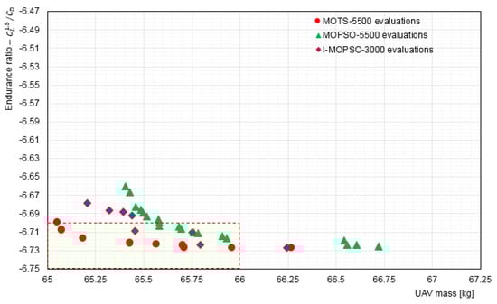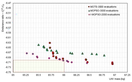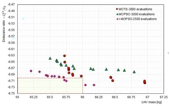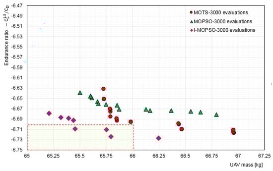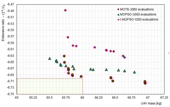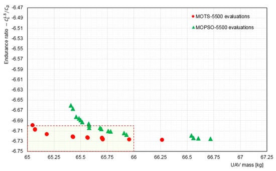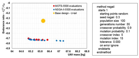 From the results presented in this section, we conclude that the Aegis UAV achieves the highest improvement in endurance ratio and mass with U-tail shape by optimisation of wing-tail design variables simultaneously. Thus, this case is chosen as an optimum design case to be investigated using interactive optimisation, with the aim being to reduce the computational time while retaining the high optimum solutions. However, for confirmation, the authors compared optimisation results for this design case with those obtained using the leading multi-objective Genetic Algorithmic (GA), (Non-dominated Sorting Genetic Algorithm-II (NSGA-II). Comparison supports the effectiveness of using the MOTS algorithm in such a design problem (see Figure 11).