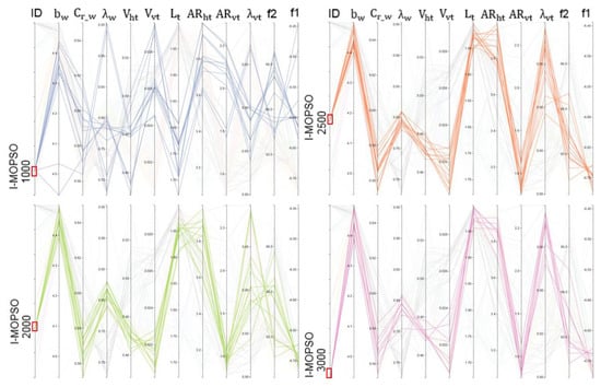To integrate the external model (Interface-AVL) with the I-MOPSO framework, the framework was amended following Tilocca []. Once the optimisation run was started, the DM interacted with the process periodically. The visualisation-based user interface in this framework used a Parallel Coordinates technique [,,] to articulate the DM’s preferences, and provide a 2D scatter graph. Both visualisation tools enabled the DM to make the best decision by recognising the existing trend and correlations between design variables, as well as objective functions []. By interacting with the parallel coordinates and 2D scatter graph, it was possible to steer the optimisation search, according to the DM’s expertise and preferences, to focus on the most interesting set of solutions, or even a single solution.