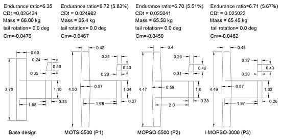 Figure 9 and Figure 10 show the aerodynamic shape design optimisation results of the Aegis UAV with U and inverted V-tail configurations, where wing and wing-tail design variables were varied simultaneously to obtain the optimum Pareto set. The optimisation results for selected compromise solutions show that the optimised UAV with inverted V-tail shapes has a higher endurance ratio and lower mass than the optimised UAV with the U-tail shape. However, the improvements in endurance ratio and mass with respect to the base design are better in the case of the UAV with the U-tail shape. For example, the endurance ratio of the optimum compromise solutions for UAV with U-tail is improved by 4.41% and 5.83%, whereas for UAV with inverted V-tail improved by 3.89% and 5.43%, respectively, when using wing and wing-tail design variables. It is evident that combining wing and tail in the optimisation process provides better performance in both endurance ratio and UAV mass.