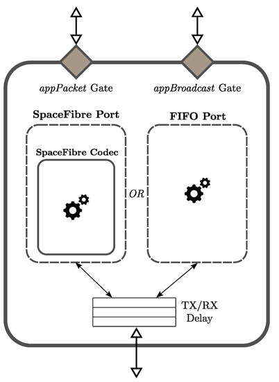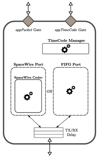 - Leoni, A.; Fanucci, L.; Jameaux, D. Simulator for HIgh-speed Networks (SHINe): An OMNeT++ simulator for SpaceFibre and SpaceWire Networks. In Proceedings of the SpaceWire Conference, Los Angeles, CA, USA, 14–18 May 2018. [Google Scholar]