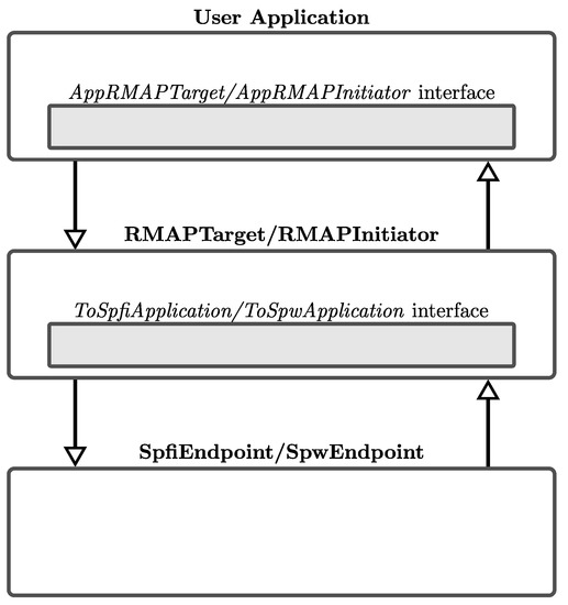 Remote Memory Access Protocol (RMAP) [14] is the most common protocol used directly on top of SpaceWire. It allows accessing a remote memory region on the target device in several operation modes. The RMAP standard specifies two types of device: i) the Initiator, which is responsible for issuing the requests and ii) the Target, which must react to the requests and, if necessary, send a reply back to the Initiator. SHINe fully implements the RMAP standard specifications, for both the Initiator and the Target. They are implemented as application modules for the SpaceFibre and SpaceWire Endpoints, actually creating an additional layer between the final application of the user and the network infrastructure (see Figure 6).