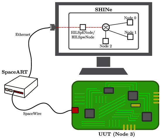 Hardware-in-the-Loop (HIL) configuration with Simulator for HIgh-speed Network (SHINe) connected with SpaceART and the Unit Under Test (UUT).