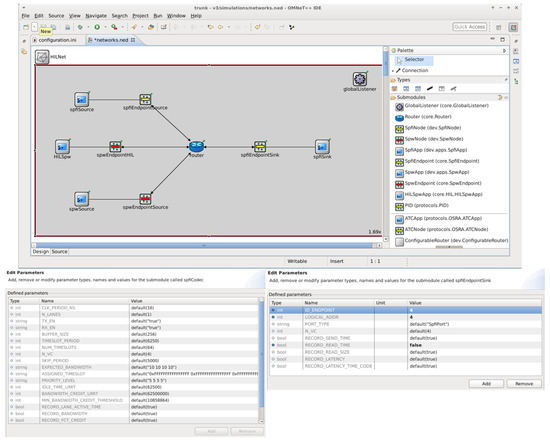 After the nodes deployment, they must be configured in order to represent the scenario that the user wants to simulate. OMNeT++ allows configuring a node in two ways: (i) directly modifying the NED file of the network, either via text editor or through the OMNeT++ GUI [18] (see Figure 9) or (ii) overwriting the parameters in the .ini file (initialisation file).