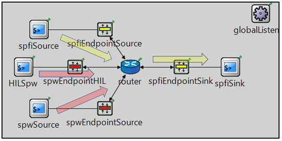 - an external hardware node (spwEndpointHIL + HILSpw), realising the bridge to the SpaceWire PXI analyser. The PXI analyser tries to send data at maximum rate to the sink;