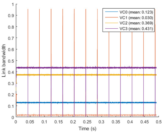 For what concerns the Virtual Channel (VC) utilization in the Routing Switch output port, it is important to check the simulated results (see Figure 11) against the Expected Bandwidth values. It can be seen that VC0, VC2 and VC3 use just slightly more link capacity than expected, with the expected being 10%, 30% and 35% for VC0, VC1 and VC3 respectively, while VC1 is under-using its bandwidth. This happens because VC1 is shared between the SpaceFibre and the two SpaceWire Data Sources. When the <OutputPort, VC> of the Routing Switch is assigned to one of the SpaceWire nodes, NChars are transferred slowly, precisely at 40 Mbps (i.e., 80% of the SpaceWire input link rate). This value is much lower than the 20% of the SpaceFibre output link rate (i.e., 400 Mbps) assigned to Virtual Channel 1, causing the Virtual Channel to slowly accumulate credit. Instead, when VC1 of the SpaceFibre Data Source gets the wormhole, the accumulated credit is spent, causing a short utilization peak.