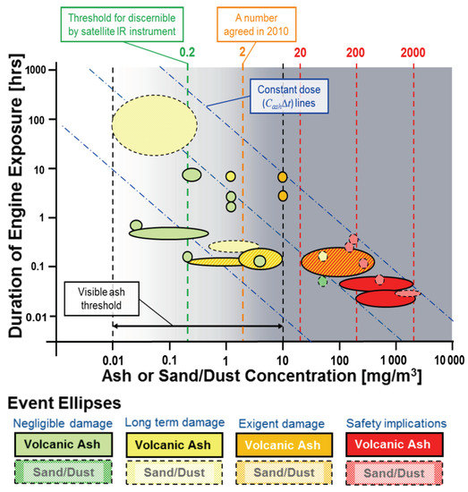 The flameout of engines may also occur due to rapid build up of other environmental dusts. Two separate events in the 1980s saw Boeing 747s flying through volcanic ash clouds and experiencing a total loss of power due to build-up of ash on NGVs that had melted in the combustor and solidified on the surfaces. Clarkson et al. [] used these events in combination with several other, less severe encounters to use what is known as the DEvAC chart, or Duration of Exposure versus Ash Concentration (although the offending particulate also includes sand dust; see Figure 1), to provide a rapid assessment of safe dose levels. The concept of dose rather than concentration is becoming accepted among civil operators and manufacturers as a more useful metric in determining the safe-to-fly limits of a given dust event.