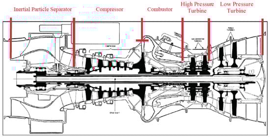 Prediction of the resultant damage is made difficult by the multitude of dependent variables. In addition to the physical properties of the particle, the chemical properties can also play a huge role. Experience from the field indicates that two helicopters with the same gas turbine engine could fly identical mission profiles in two separate areas of Southwest Asia, but suffer contrasting maintenance issues. The major difference appears to be geographic location, which suggests that the specific mix of ingested sand may have an important effect on degradation mechanisms []. There is also evidence to suggest that the dust composition on the ground is markedly different to what each stage of the gas turbine is subjected to, owing to physical sorting processes along the way [].
