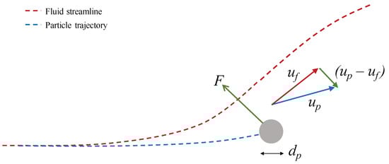 The particle is initially carried towards the cylinder by the flow. The cylinder’s presence is felt by the flow, which gradually changes direction and is diverted around the cylinder. The rate of change of direction is a function of the flow velocity and dynamic viscosity. The particle’s inertia causes an apparent delay in its response, which increases with particle momentum, itself a function of particle density and diameter. A relative velocity is set up between the particle and carrier phase, which induces a drag force, which acts to persuade the particle towards the new fluid streamline. This is depicted in Figure 3.