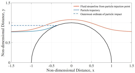 Impingement of the outermost trajectory of particles injected with an initial particle Reynolds number of 100, Stokes number of 1, and non-Stokes drag parameter, , of 1000. The fluid streamline from injection point is also shown, illustrating an impact efficiency of around 0.93 for this case.
