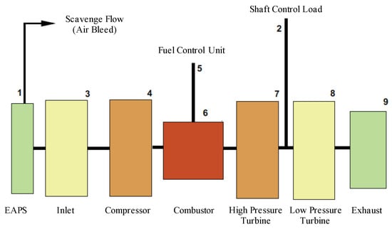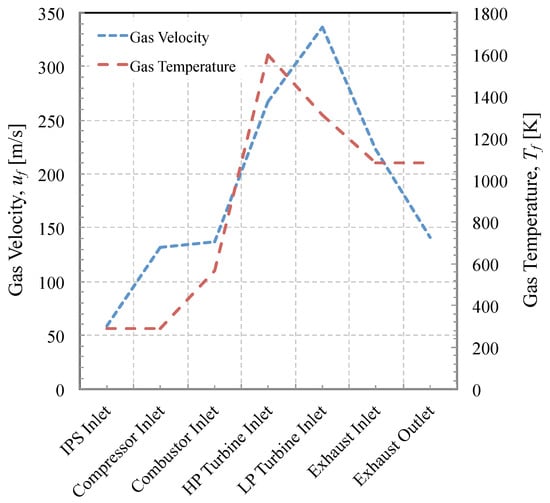 The T700-GE-701c is a turboshaft engine capable of delivering 1239 kW of maximum continuous shaft power. We simulated the operation of a turboshaft similar to the T700 engine using the zero-dimension gas path analysis tool “GSP” (Gas Simulation Program), developed by Netherlands Aerospace Centre (NLR) (At the time of writing, the program is available from www.gspteam.com/ under license. Version 10.016 was used in the current study). A diagram of the turboshaft model is given in Figure 5. The IPS is included, labelled “EAPS”—Engine Air Particle Separator. The power turbine load had an input value. The compressor had an externally-controlled rotor speed, and the power turbine had a power balance at rotor speed option. The software computes the fuel flow required to maintain a specified shaft power load and RPM (revolutions per minute). We can examine the fuel flow required for a sweep of shaft power load and examine the temperature and pressure at each sub-system block. For the cylinder model, we required the gas temperature, viscosity, density and velocity. Since it is a zero-dimension model, the software only outputs scalar quantities. The mass flow rate, combustor exit temperature, pressure and ratio of specific heats are included in this, but the other quantities must be inferred by applying mass continuity, ideal gas law and Sutherland’s correction (Ch. 9, []).