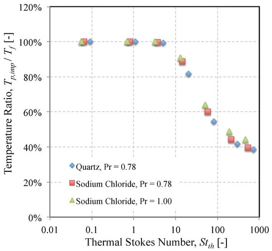 A thermal Stokes number of much less than unity indicates that the particle will equilibrate with the gas temperature in a fraction of the time it takes to pass over the vane. A thermal Stokes number of much greater than unity indicates that the particle will not reach the temperature of the gas in the time taken to pass the NGV. If the gas temperature exceeds the melting point of the particle, then a thermal Stokes number of unity or less will lead to deposition, provided the particle impacts the surface. For particles with a thermal Stokes number of greater than one, deposition is less likely, owing to the presence of the solid phase in the particle.