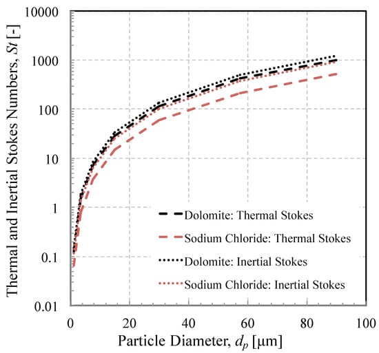 Variation of thermal and inertial stokes number as a function of particle diameter for two minerals.
