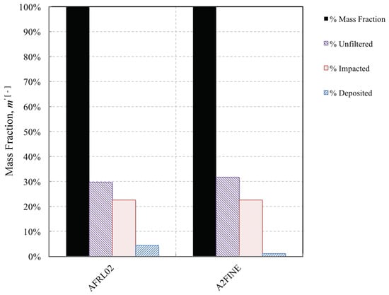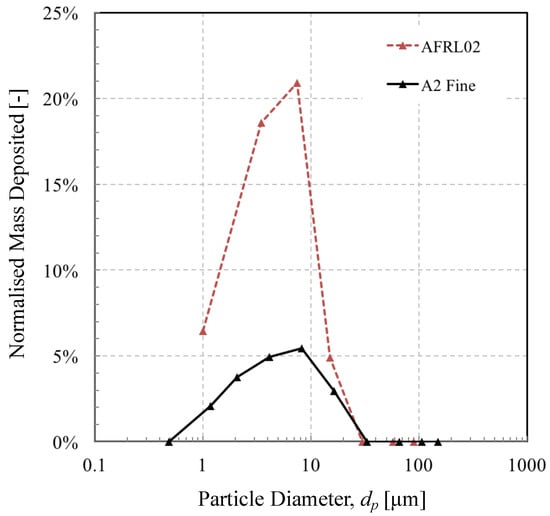 The significance of this is that a reduction of deposition may be achievable with some control of inertial and thermal Stokes number. As shown in Figure 10, both Stokes numbers increased with particle diameter. However, since impact efficiency increases with momentum Stokes number, but sticking efficiency decreases with thermal Stokes number, there may be an optimum operating point for a given dust that leads to a minimum overall accumulation efficiency; or, rather perhaps more importantly, these results suggest that there is a key sub-range of particle diameters in a given test dust that are more likely to deposit. This is illustrated in Figure 11, which shows the proportion of mass deposited relative to the initial mass fraction. The effect of the competing Stokes numbers is evident, in this case displaying a preponderance of particles with diameters of around 4–10 microns to deposit. If one were to mitigate against deposition by using a device to remove particles before they have a chance to deposit, such a size range may be targeted in the design requirements stage.