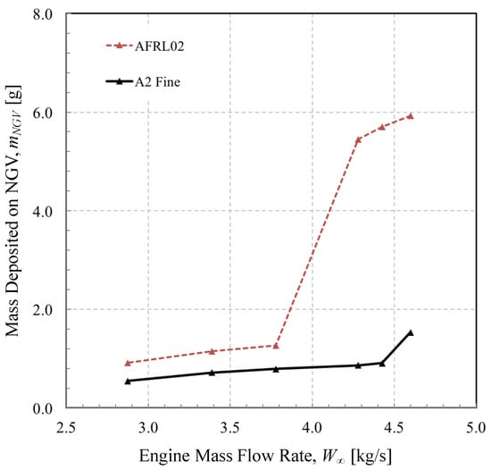 Effect of engine mass flow rate on the mass of material deposited during a dose of 36 gs/m in a T700-GE-701c turboshaft engine.
