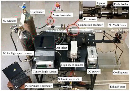 The 2D-radial hybrid combustion burner (Figure 1) was previously described [26,27,28,29,30,31,32] and is based on the original design by SPLab [33,34]. Gaseous nitrogen is used to stabilize the chamber pressure during combustion and terminate the HTPB-O2 reaction after turning off oxygen, while compressed air is used to save nitrogen before combustion and cool off the chamber after combustion. Gaseous oxygen is axially injected into the fuel grain port (a center perforated cylinder) at a mass flow rate of 5 g/s, controlled by a Bronkhorst F202 flowmeter. An automatic control system, which is equipped with a logical circuit, a pressure transducer, four solenoid valves, and four electromagnetic relays, governs the solenoid valves opening or closing every 30 ms to keep the combustion chamber in a quasi-steady state. A charge (4.5 mm OD × 0.8–1.2 mm thickness) of B/KNO3 (40/60) which is fixed upstream of the fuel grain port is activated by an Nd:YAG laser, followed by the ignition of the inner surface of the cylindrical fuel grain under oxygen flow. A high-speed camera is used to record the regression process of the inner burning surface upstream cross-section at 1500 fps.