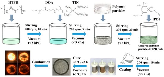 The compositions of the tested polymer particles/HTPB composite fuels are tabulated in Table 2. The preparation process of HTPB-based fuels was described in our previous studies [31] and is shown in Figure 2. The cured HTPB was prepared at a ratio NCO: OH of 1.05. Briefly, the corresponding content of HTPB was dispersed under vacuum (<5 kPa) with a blade mixer rate of 200 rpm for 10 min, followed by DOA and TIN for 5 min. The resulting mixture was mixed with polymer particles for 20 min, followed by IPDI stirring for another 10 min. The uncured polymer particles/HTPB fuels were cast into several molds to get 4–6 samples (16 mm OD × 4 mm ID × 30 mm length). The samples were solidified at 36 °C in an oven for 23 h and a 2 h post-cure bake at 60 °C.