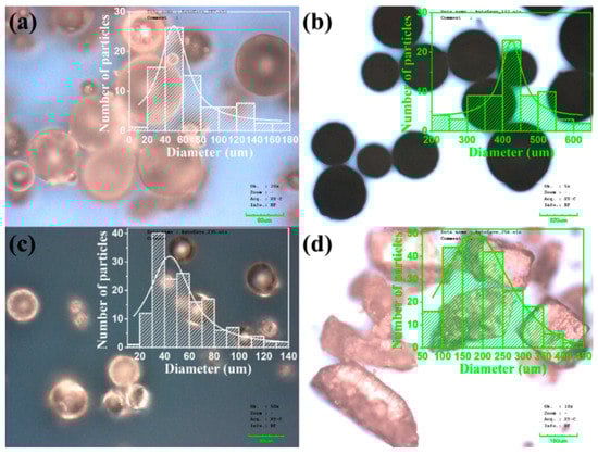The morphological features and diameter distribution of raw polymer particles were detailed by Confocal Laser Scanning Microscope (CLSM, LEXT OLS3100, Olympus, Tokyo, Japan) on glass substrates; see Figure 3. PE paraffin, oleamide, polydextrose, and PEG respectively have an average diameter of 49.9 μm, 425.4 μm, 44.0 μm, and 182.0 μm.