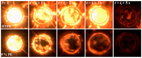 Figure 4 shows the regression state of 5% PE particles/HTPB composites during burning at t = 0 s (tign), 1 s, 2 s, 3 s and 5 s, respectively. The red circle represents the diameter of the initial internal burning surface diameter (4 mm). The brightness of the 5% PE particle formulation image is darker than HTPB, suggesting less energy release compared to HTPB and making difficult regression data collection. From the viewpoint of cross-section diameters which were processed as ṙ(t) vs. t, the 5% PE particle formulation shows a slightly enhanced regression rate compared to HTPB.