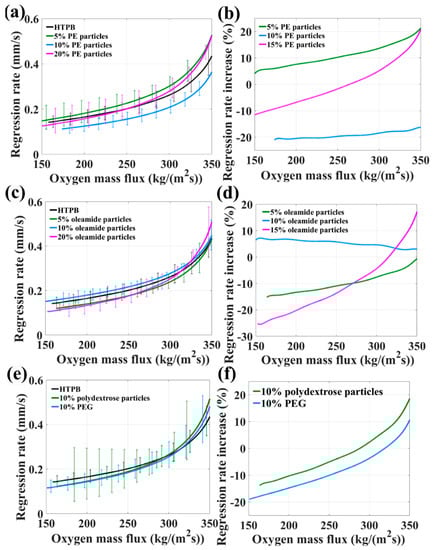(a,c,e) Regression rate and (b,d,f) percent increase in regression rate vs. oxygen mass flux for low molecular mass polyethylene (PE paraffin) (5%, 10%, and 20%)/HTPB, oleamide (5%, 10%, and 20%)/HTPB, 10% polydextrose/HTPB, and 10% PEG6000/HTPB composite fuels, respectively.