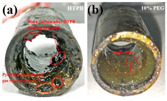 Images of (a) pure HTPB and (b) 10% PEG particles/HTPB composite fuel grains after terminating combustion.
