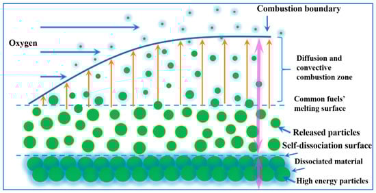 SDFS is a concept borrowed from composite modified double-base propellant [36] and new for hybrid propellant burning, whereby the binder will release fuel particles from a block of composite solid fuel over some critical threshold condition (for example, a melting temperature). Combustion visualization shows a lot of burning granules of the implemented filler escaping from the burning surface into the gas flow; see Figure 7. During combustion, the solid fuels disintegrate into many small parts due to melting and decomposition of binder, and flow out with the sweep of oxygen flow, realizing the structural self-disintegration phenomenon. The self-disintegration process needs less energy and reaction time than the evaporation and thermal decomposition processes of conventional fuels so that the mass transportation per unit time can greatly improve, and the regression rate and mass burning rate will be enhanced. Thus, the scattering of particles associated with the self-disintegrating matrix structure can promote propulsion performance.