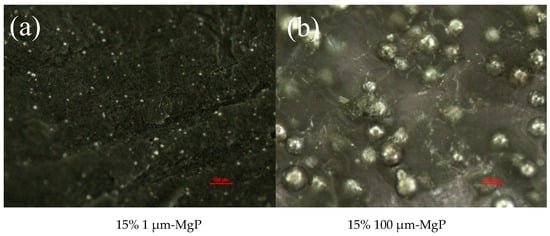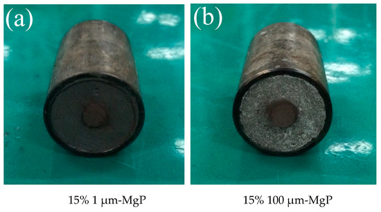 Two sizes of magnesium particles (1 and 100 μm) were chosen to analyze the effects on combustion of composite fuels based on paraffin #58. Their main properties are listed in Table 7 while their SEM images are shown in Figure 8. The tested MgP have high purity, and the specific surface area of small particles is much bigger than that of large particles, indicating that the small magnesium powders have higher reactivity and are easier to burn. Figure 9 shows optical microscope images of the two MgP/paraffin composite fuels and Figure 10 shows two samples ready for combustion test. The composition of the tested MgP/paraffin fuels is indicated in Table 8.