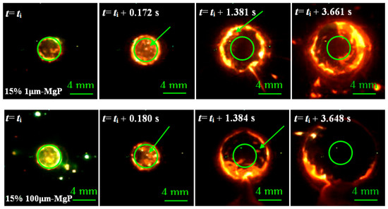 Figure 11 illustrates the regression process of magnesium particles/paraffin composite fuels and the arrows point out the burning Mg particles which disintegrate from the paraffin matrix. As the figure suggests, the structural self-disintegration of Mg particles/paraffin composite fuels was more obvious under high oxidizer mass flow rate, and the flame of magnesium particles was bright which shows high energy.