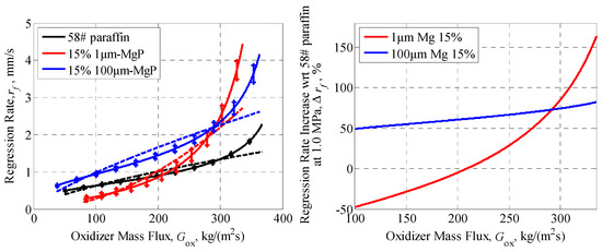 rf vs. Gox (left) and percentage increase in regression rate (right) of magnesium particles/paraffin composite fuels, at 1 MPa, pointing out a strong particle size effect. The dotted lines are fitting curves according to the semi-empirical formula: .