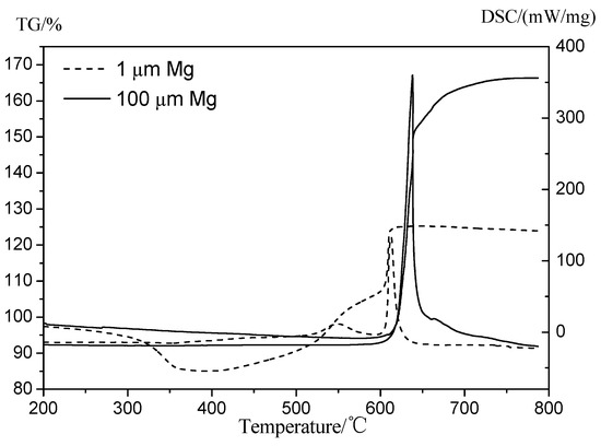Differential scanning calorimetry/thermogravimetry (DSC/TG) results of small (dotted lines) and large (continuous lines) Magnesium particles showing dependence on particle size. The curves with sharp peaks are the DSC analyses.