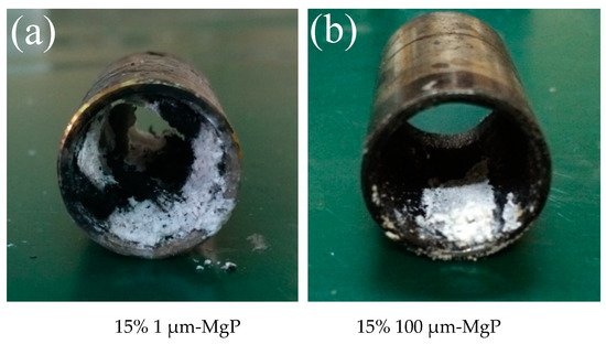Samples tubes after burning of small (a) and large (b) magnesium particles/paraffin composite fuels.