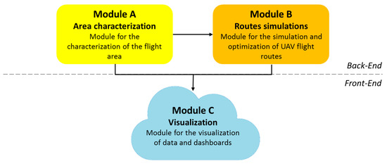 From a functional point of view, the FLIP modules follow a user-centric approach, providing an environment accessible to users (e.g., UAV operators) through front-end and back-end components of the system. Referring to Figure 2, Module A allows the management and analysis of input data characterizing the flight area in terms of orographic characteristics, buildings, obstacles, and population density. Module B implemented the algorithms, presented in Section 3, for the analysis (and possibly optimization) of flight routes minimizing the risk of the mission. Finally, Module C represents the single front-end component for the visualization and analysis, through a web interface, of the output data of the FLIP process, i.e., the results of the numerical elaboration for the calculation of the risk, the trajectories that minimizes it, as well as all the main input data used for the simulation. The data are extracted and exchanged through the different modules by means of APIs and web-services. An explanatory screenshot of the developed web application is provided in Figure 3.