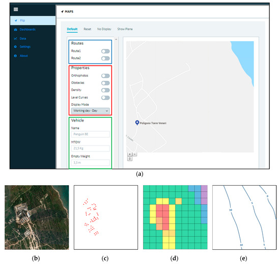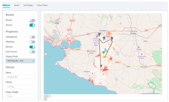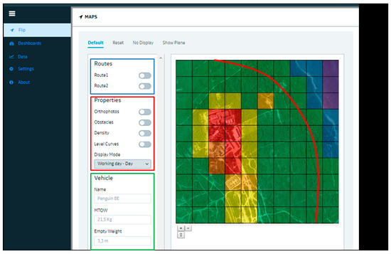 Five different views are available: (1) map view, (2) orthophoto view, (3) obstacle map, (4) population density grid and (5) level curves view. Each view can be turned on/off by means of switches in the red area of the graphical user interface (GUI). The switches in the blue area of the GUI are used to turn on/off the display of one or more routes calculated using the risk analysis algorithm. Different visualization view can be combined, in different layers, as desired, as shown in Figure 4, where Route 1, orthophoto view and population density map are simultaneously turned on. The green area of graphical interface reports some data about the vehicle under consideration that has been used for the trajectory definition and related risk calculation.
