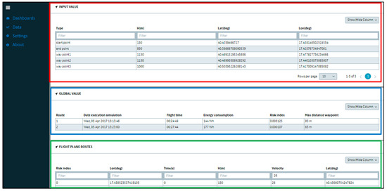 Another section of the FLIP application is dedicated to the visualization of detail data in numerical format (Figure 5). Height, longitude and latitude of the input points used for the design of the trajectory (i.e., start point, end point, and intermediate waypoints) and global performance indexes for the proposed routes (i.e., flight time, energy consumption, risk index, and maximum distance from waypoints) are reported respectively in the red and the blue sections.